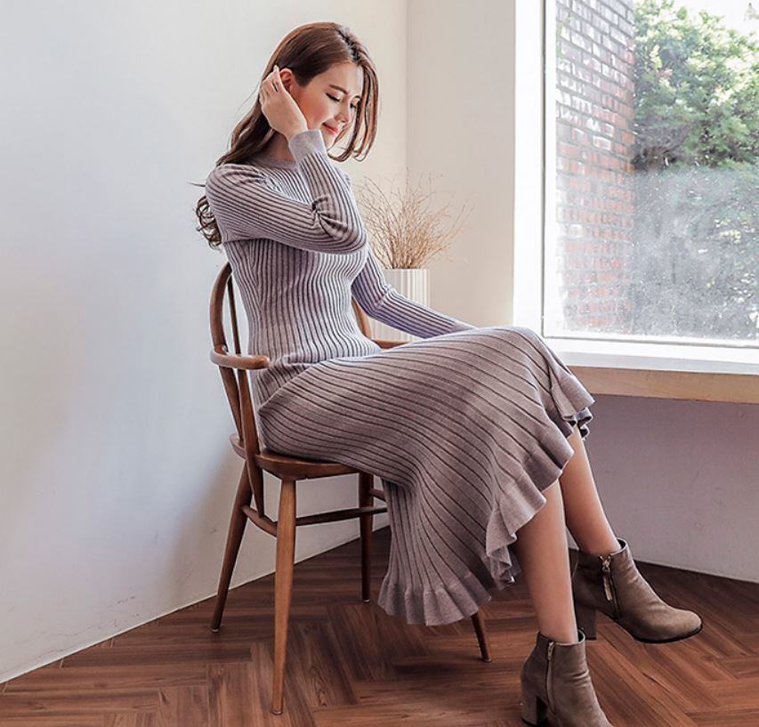 マーメードラインと裾のフリルがとってもフェミニンなロング丈ニットワンピ♪