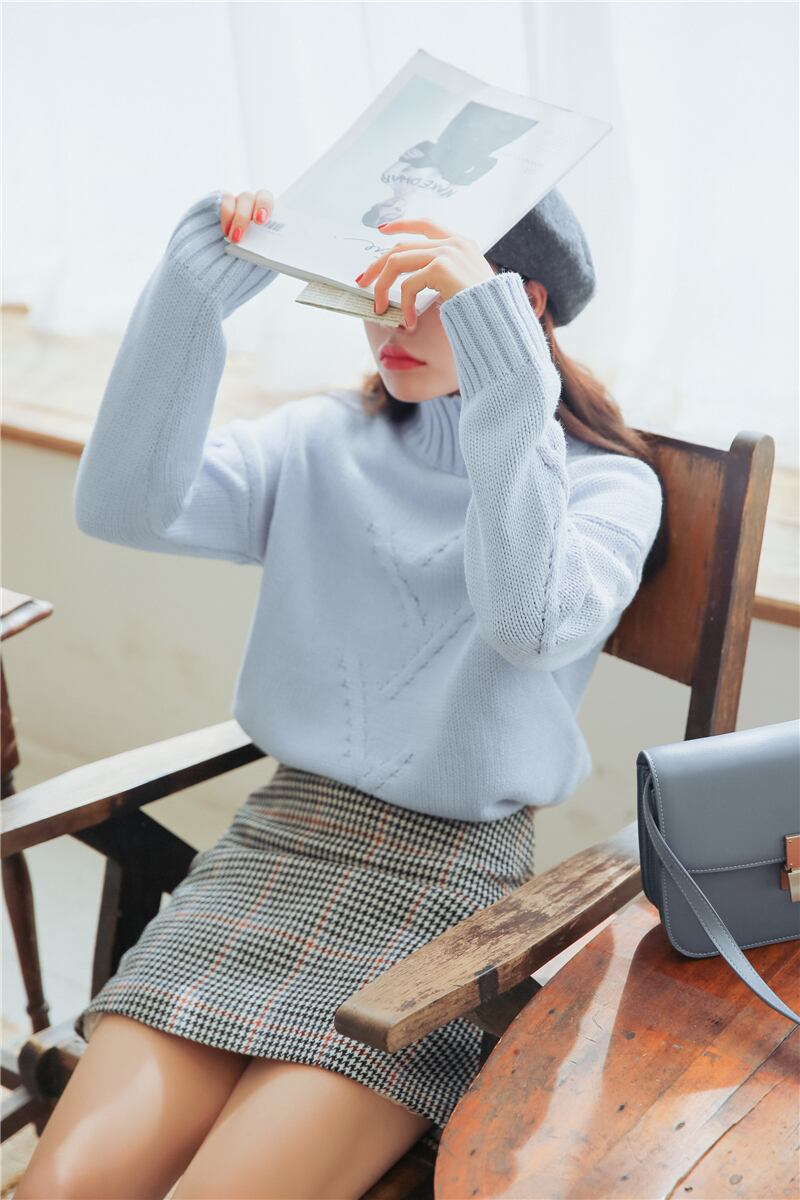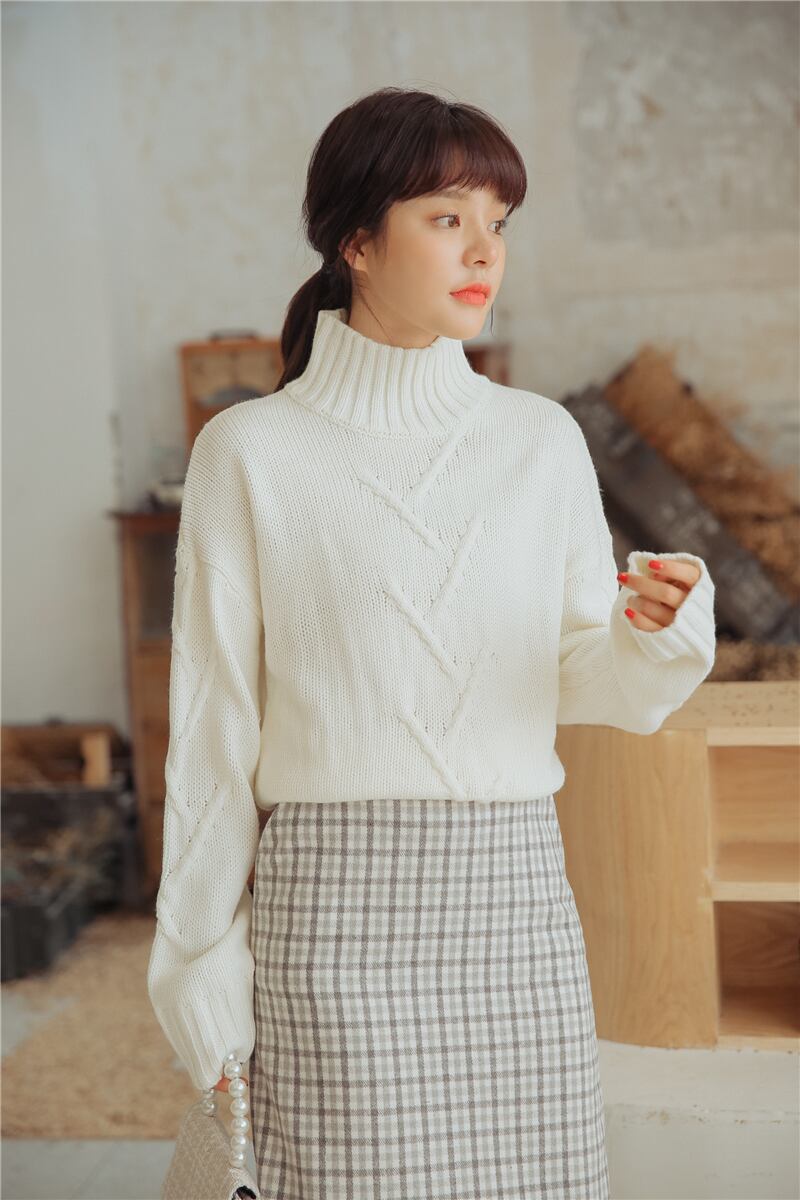 シンプルで清楚な雰囲気のケーブル編みハイネックニットです。