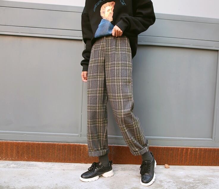 定番人気のチェック柄パンツは、ハイウエストで履いてヒールと合わせると脚長効果抜群の一枚です。