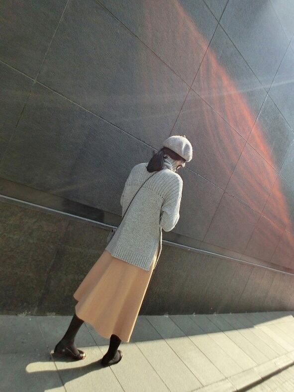 ヒップにかかる着丈で、スカートでもパンツでも合わせやすいのもポイント。