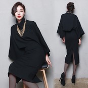 ドルマンスリーブと後ろスリットのミモレ丈タイトスカートのセットアップ。