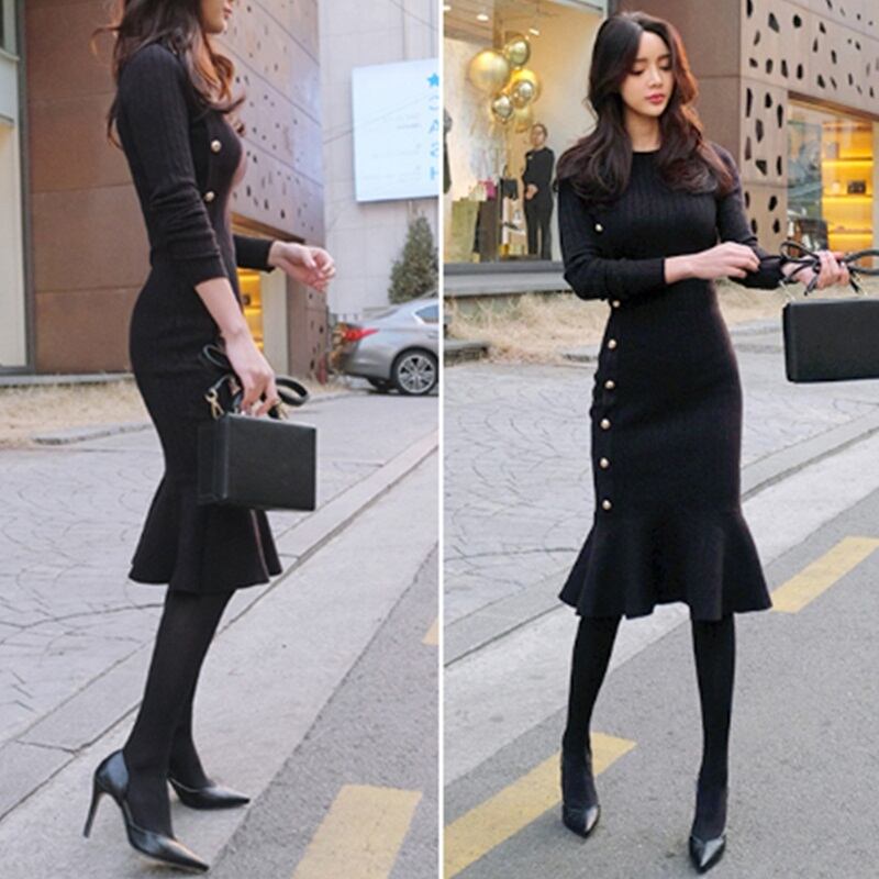 レディなマーメイドラインが美しいブラックのリブニットワンピ。