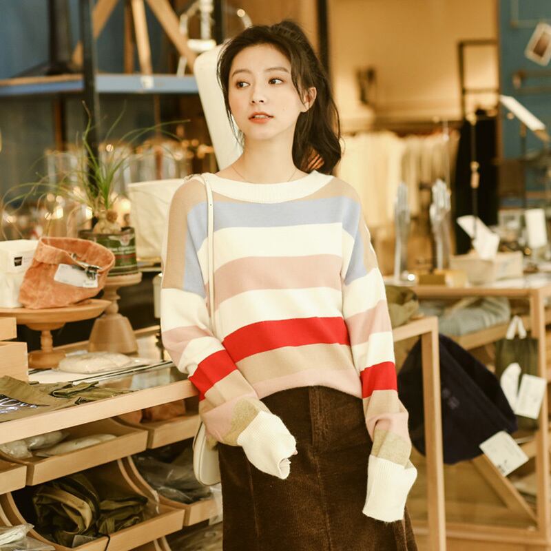 太めのボーダーがカジュアルなデザインのニットトップスです。