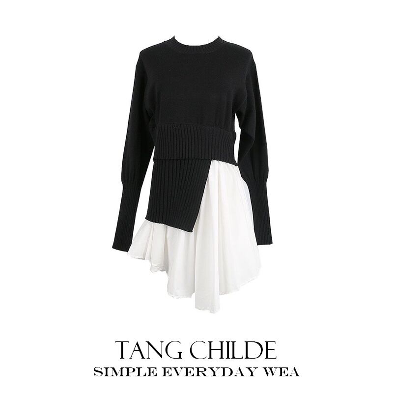 ブラウスが裾にドッキングされているアシンメトリーデザインのニット。