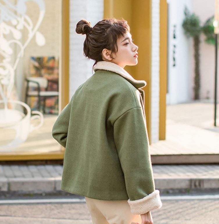 くすんだようなお色がトレンドを感じさせる、襟元と袖口のボアが可愛いショートコート♪
