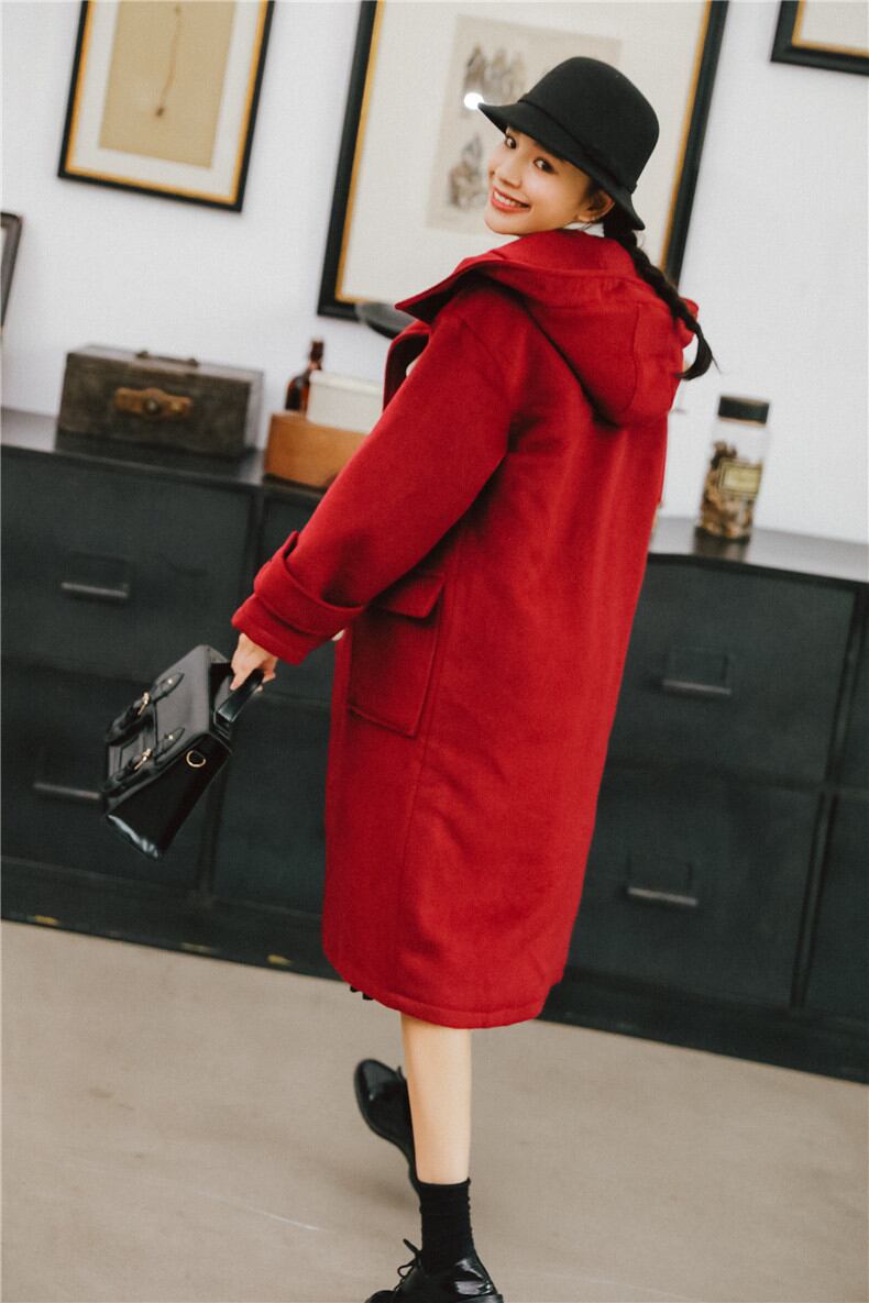 パッと目を惹く鮮やかなレッドカラーのロング丈ダッフルコートです♪