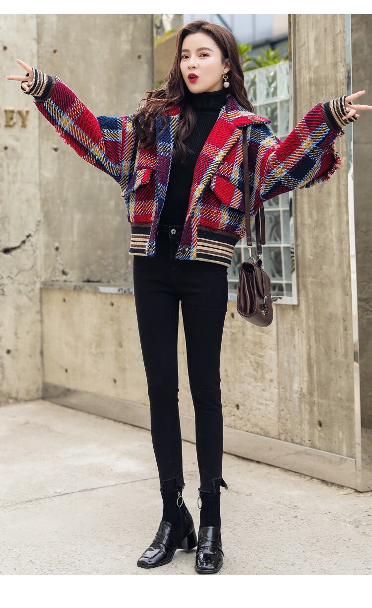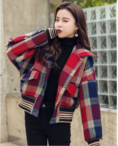 秋冬 NEW 人気 ウールコート チェック柄 ショート丈 レトロ ブルゾン フラップ付きポケット 襟付き 前ボタン ドロップショルダー カジュアル ボリュームスリーブ ct0324 | 【Furure 】Base店