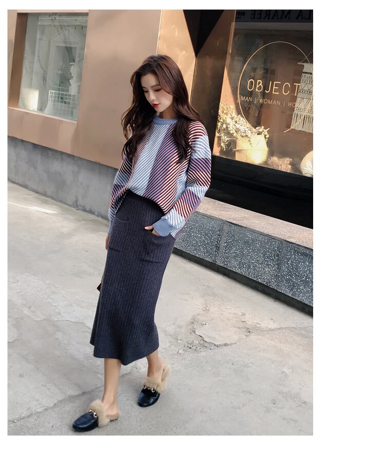 おすすめ 冬物 セットアップ ツーピース オーバーサイズニットトップス ゆったり 斜めストライプ タイトスカート ミモレ丈 バックスリット ポケット付き ct0331 | 【Furure 】Base店