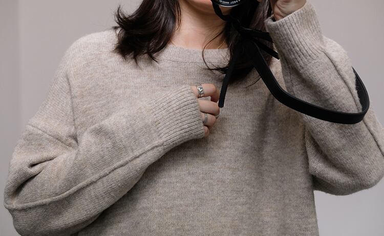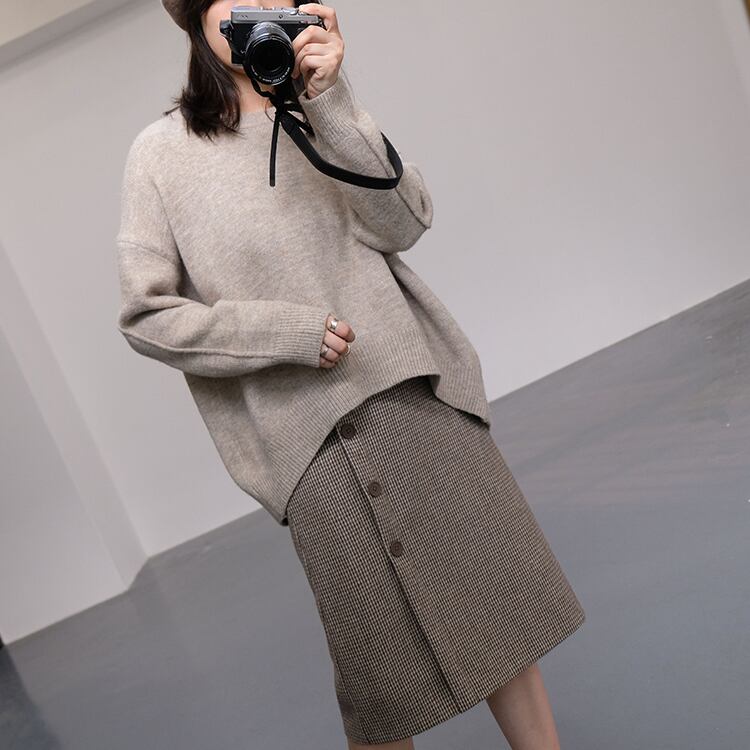 シンプルで幅広く着まわしやすいデザインのニットプルオーバー。