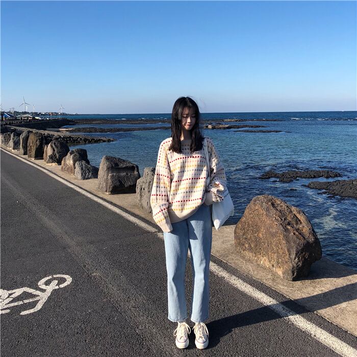 カラーレスになりがちな冬の時期によく映えるドット柄のニットトップス。