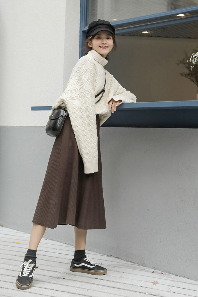 落ち着いた色合いが大人っぽい、清楚な雰囲気の膝下丈ニットスカートです。