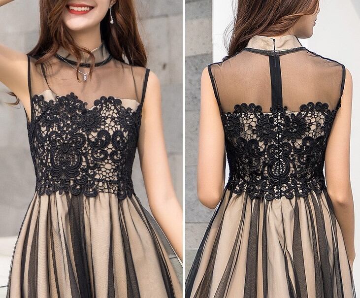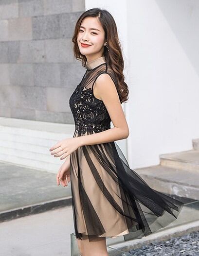 透け感があるブラックシフォンとシャンパンベージュが重ねてある上品なドレス。フレアスカートもひざ丈で清楚。結婚式などパーティーで活躍します。季節問わず使える一枚です。
