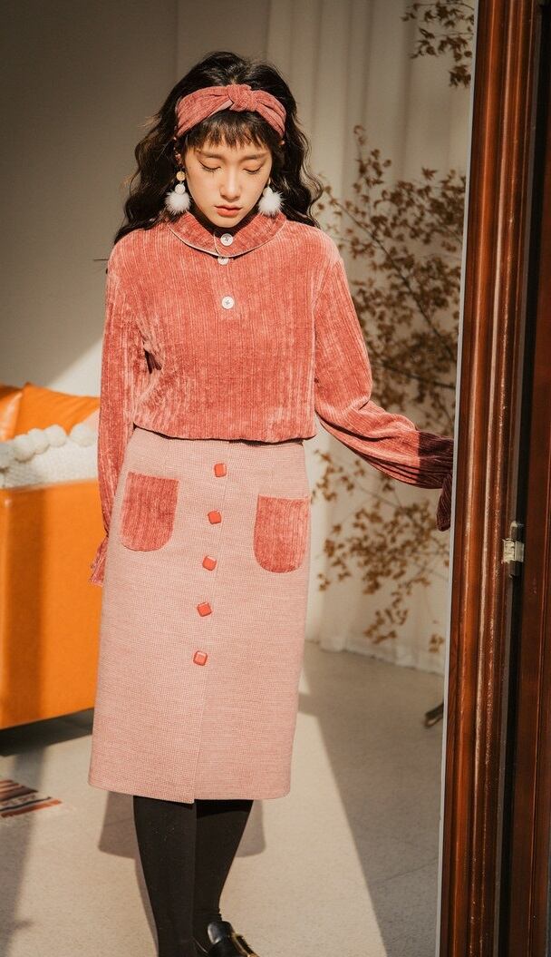 落ち着きのある明るめカラーが冬のコーデを彩るミディアム丈スカート。