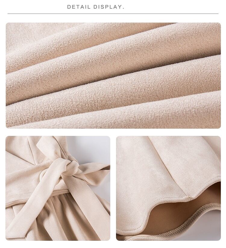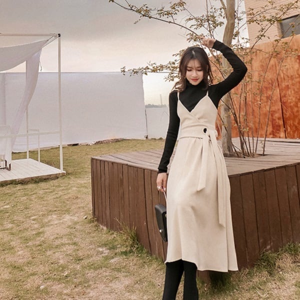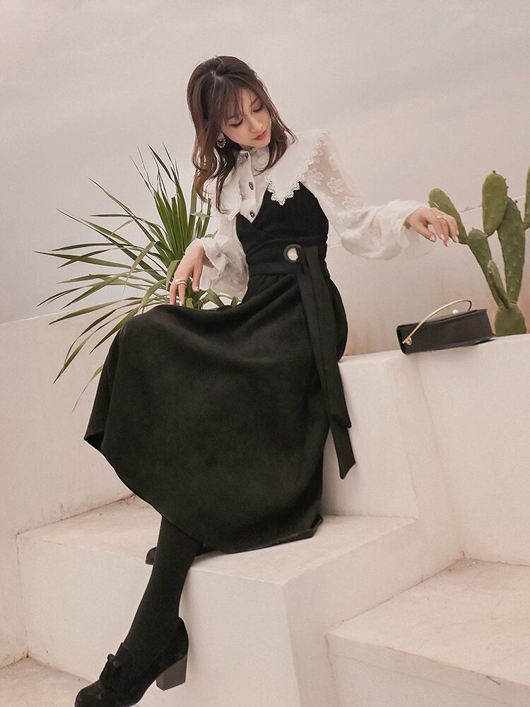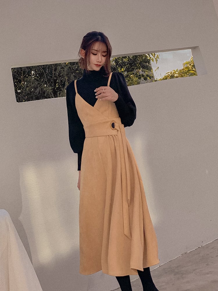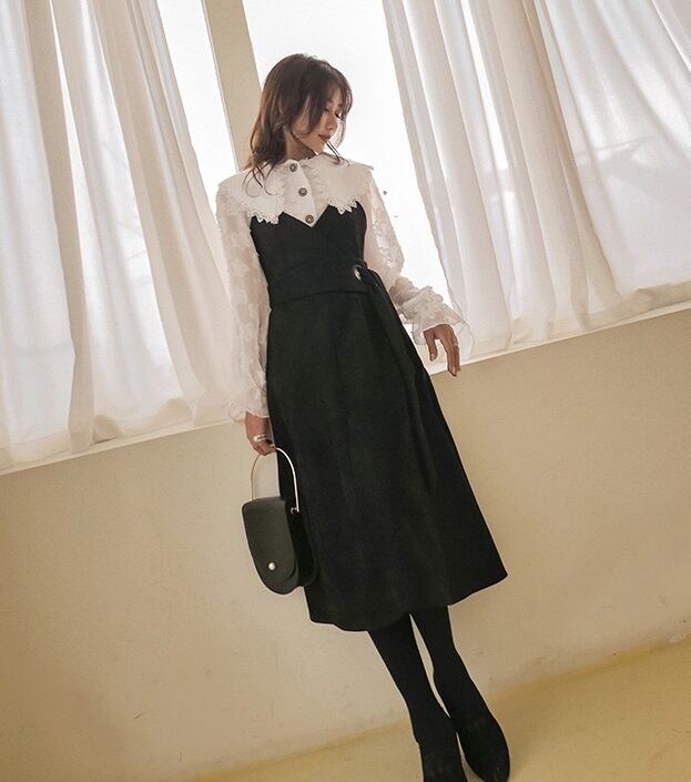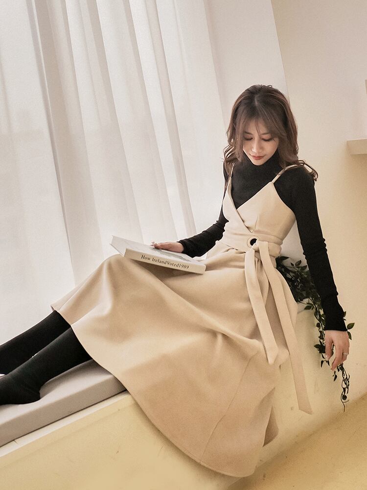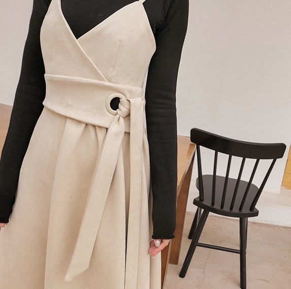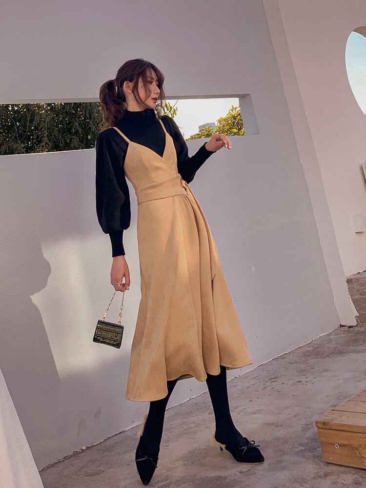 子供っぽくならないような丈感と、カシュクールデザインから作り出される深Vネックがポイント。