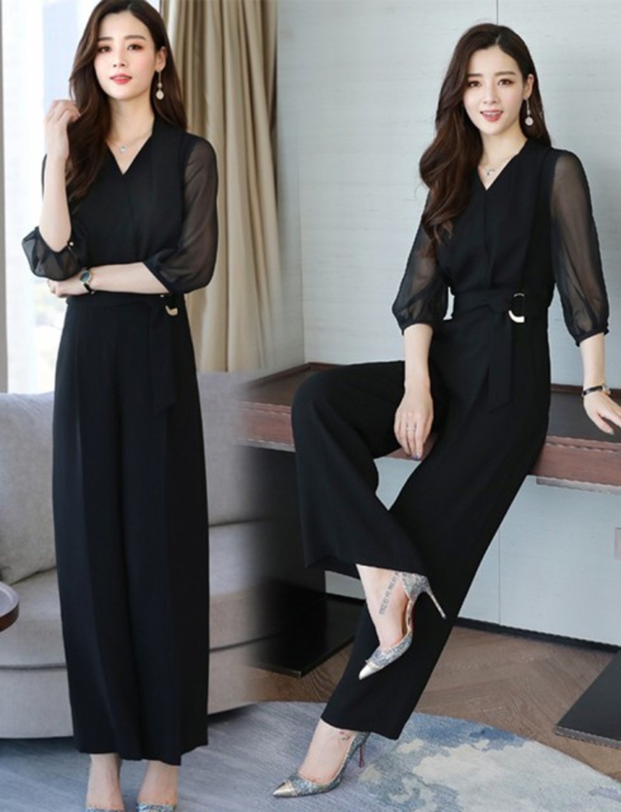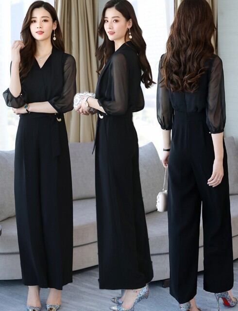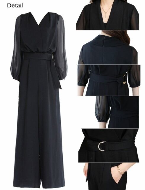 パーティーや結婚式でも活躍するパンツドレス。袖がシースルーになっているので、野暮ったくならず、ショールやカーディガンも必要ないので楽チン♪
