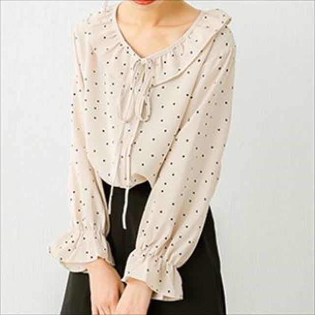 襟のフリル&シャーリングがふんわりした女の子らしいシルエットを作る長袖ブラウスのご紹介です。