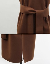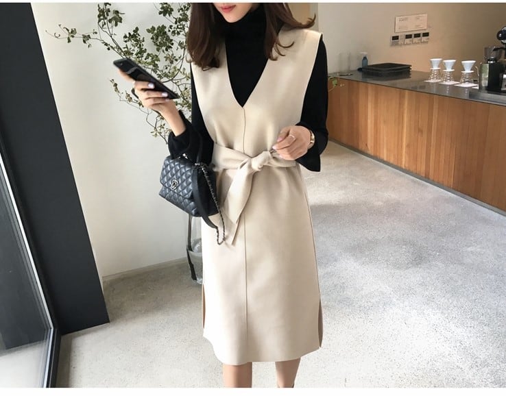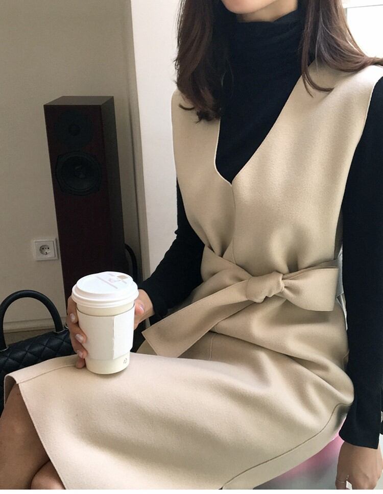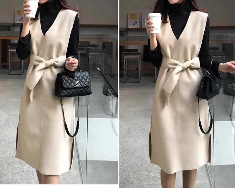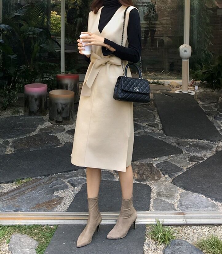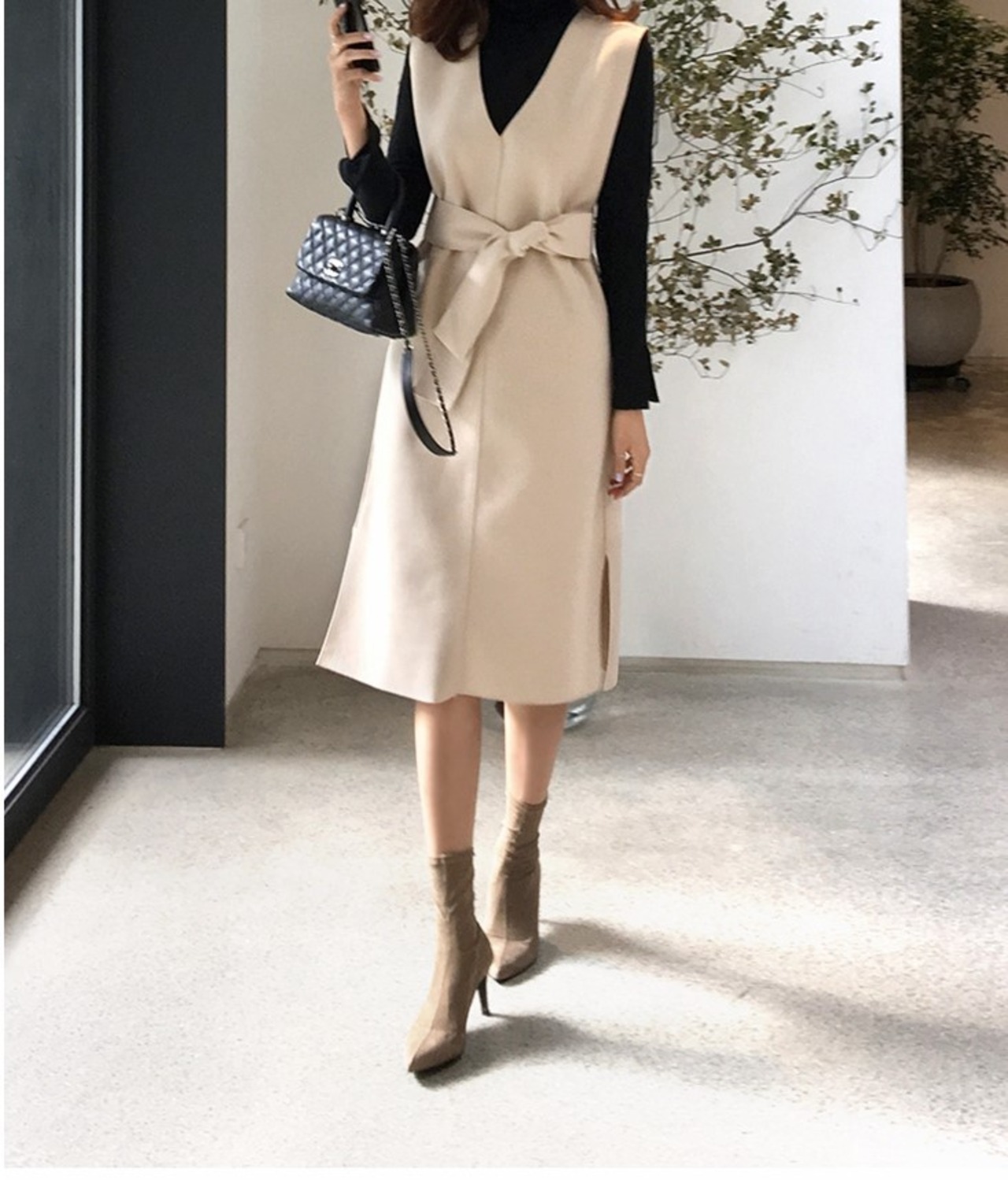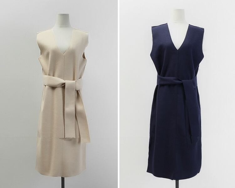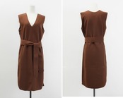 ジャンパースカート風ワンピース。Vネックなので上品でインナーも合わせやすいです。同素材リボンのウエストマークで着やせ効果も♡