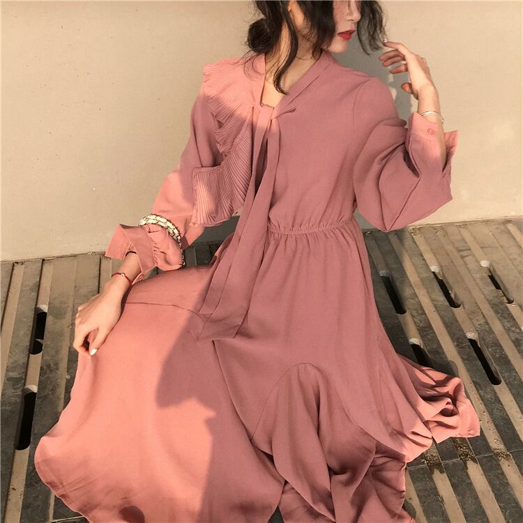 新作 人気 トレンド 春 ロングワンピース 長袖ワンピース フレアスカート アシンメトリー フェミニン パーティ 結婚式 リボンタイ ボウタイ ハイウェスト ウエストゴム ct0858 | 【Furure 】Base店