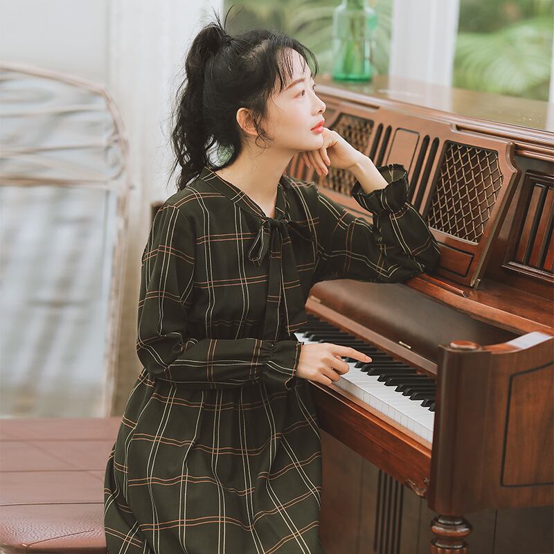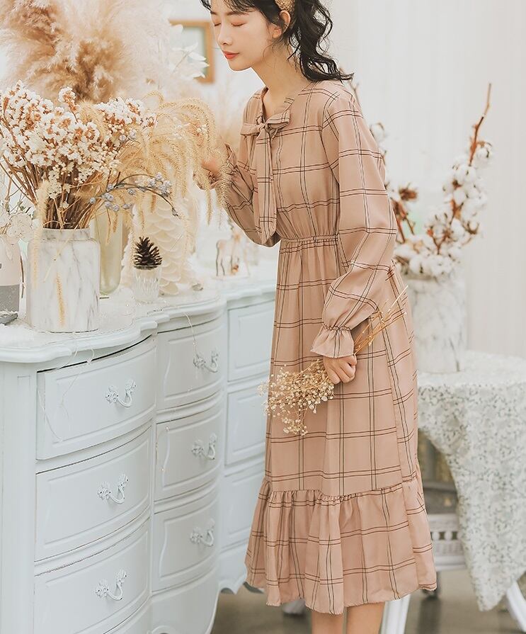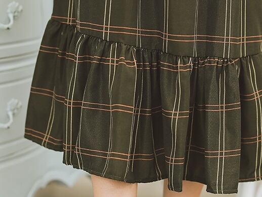 シックなチェック柄と首元のボウタイリボンが、きちんと感をプラス。
