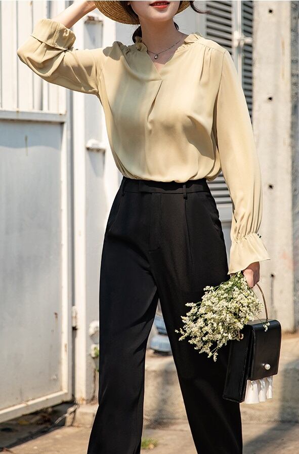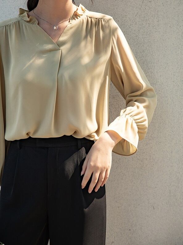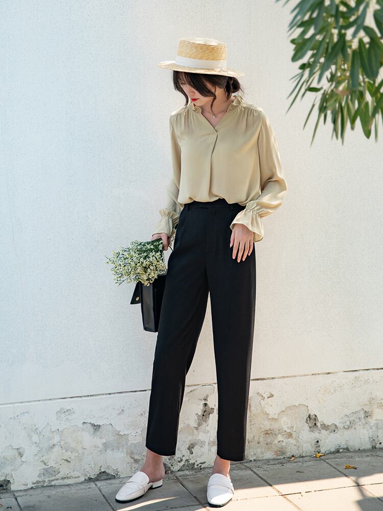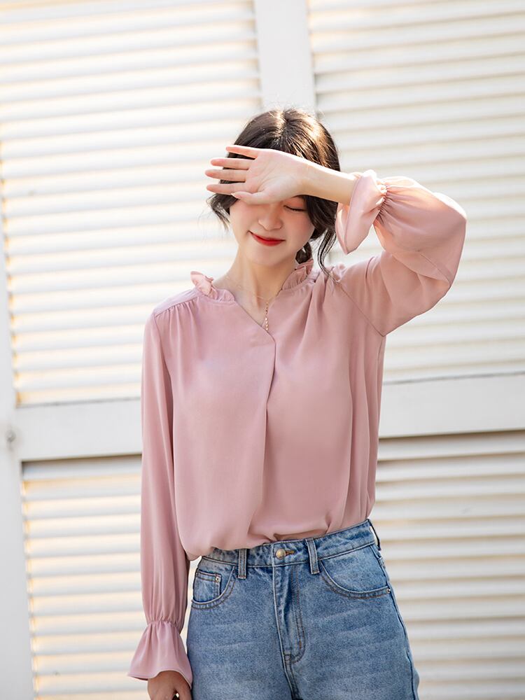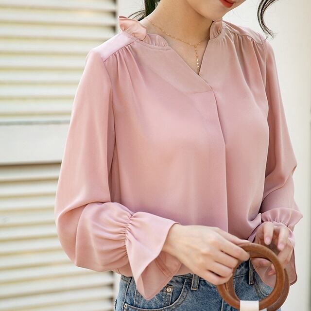 落ち着いた雰囲気のブラウスに、ネックのフリルで甘さのスパイスをプラスした今季おすすめの一枚です。