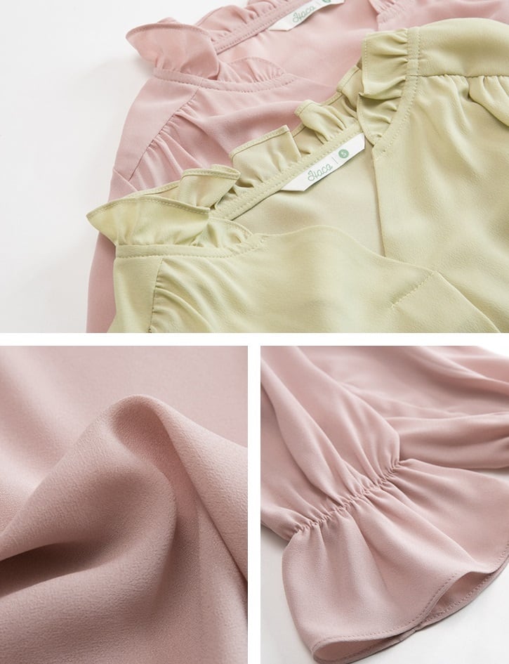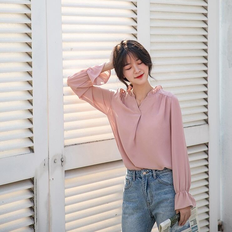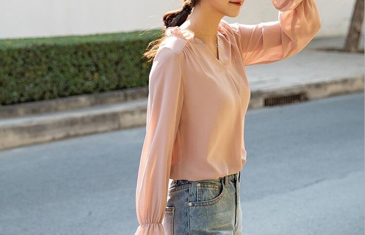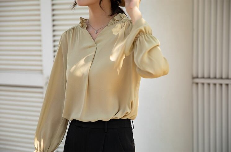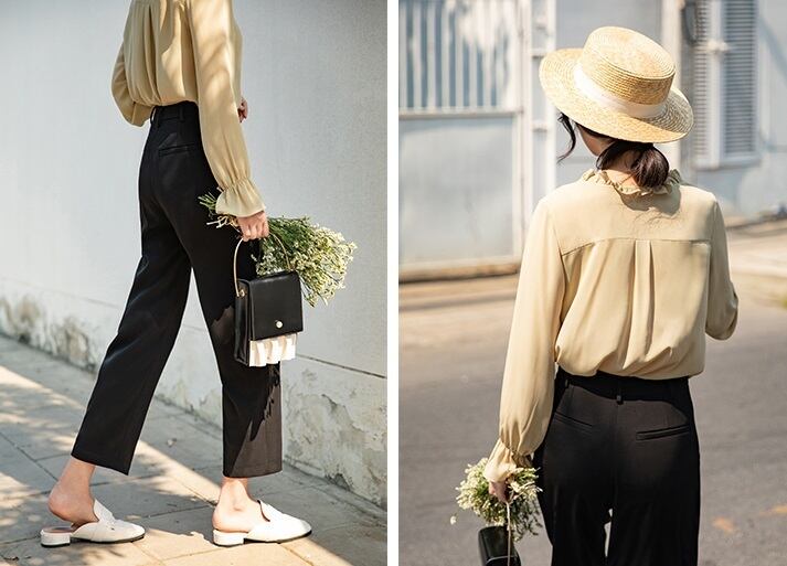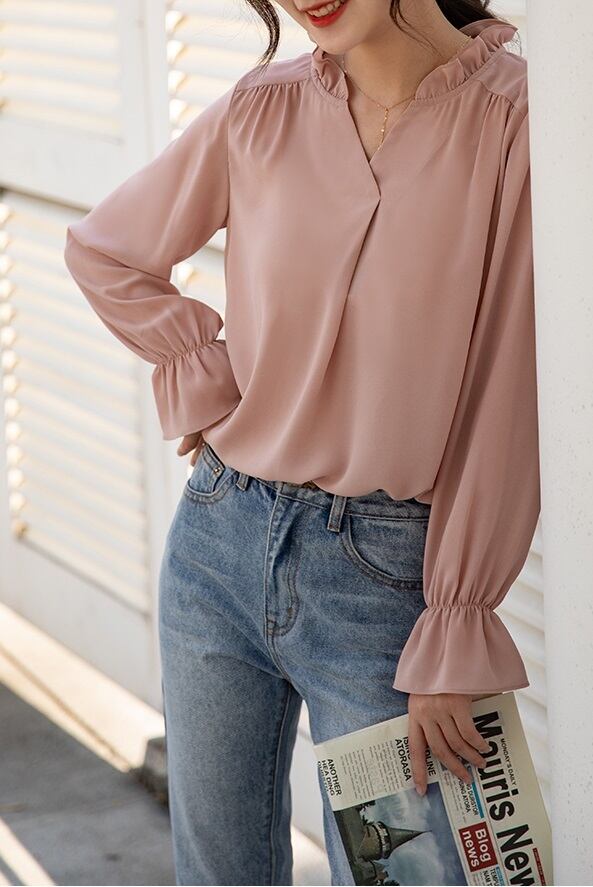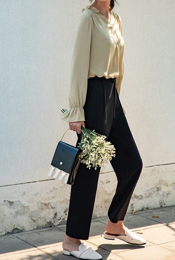 落ち着いた雰囲気のブラウスに、ネックのフリルで甘さのスパイスをプラスした今季おすすめの一枚です。