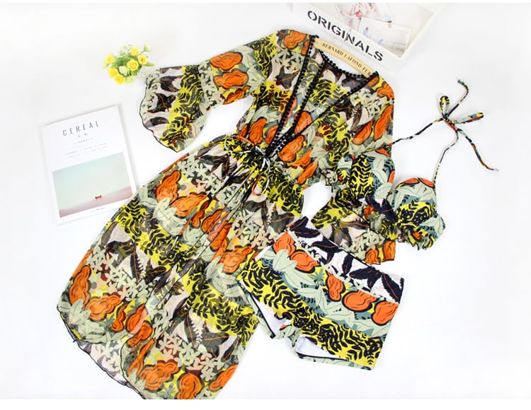 リゾートやビーチにぴったりのプリント柄で視線を独り占め出来ちゃうビキニと羽織の3点セットが仲間入り♪