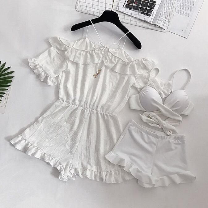 ビキニの上に重ねられるのが嬉しいロンパース付きの、スイムウェア3点セット◎