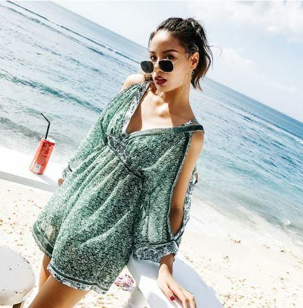 グリーンのボタニカル柄がリゾート感たっぷりなビキニ&ワンピースの3点セットです。
