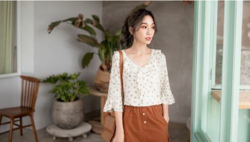 ふんわりとした生地感にフリルデザインがフェミニンな七分袖ブラウスのご紹介です。