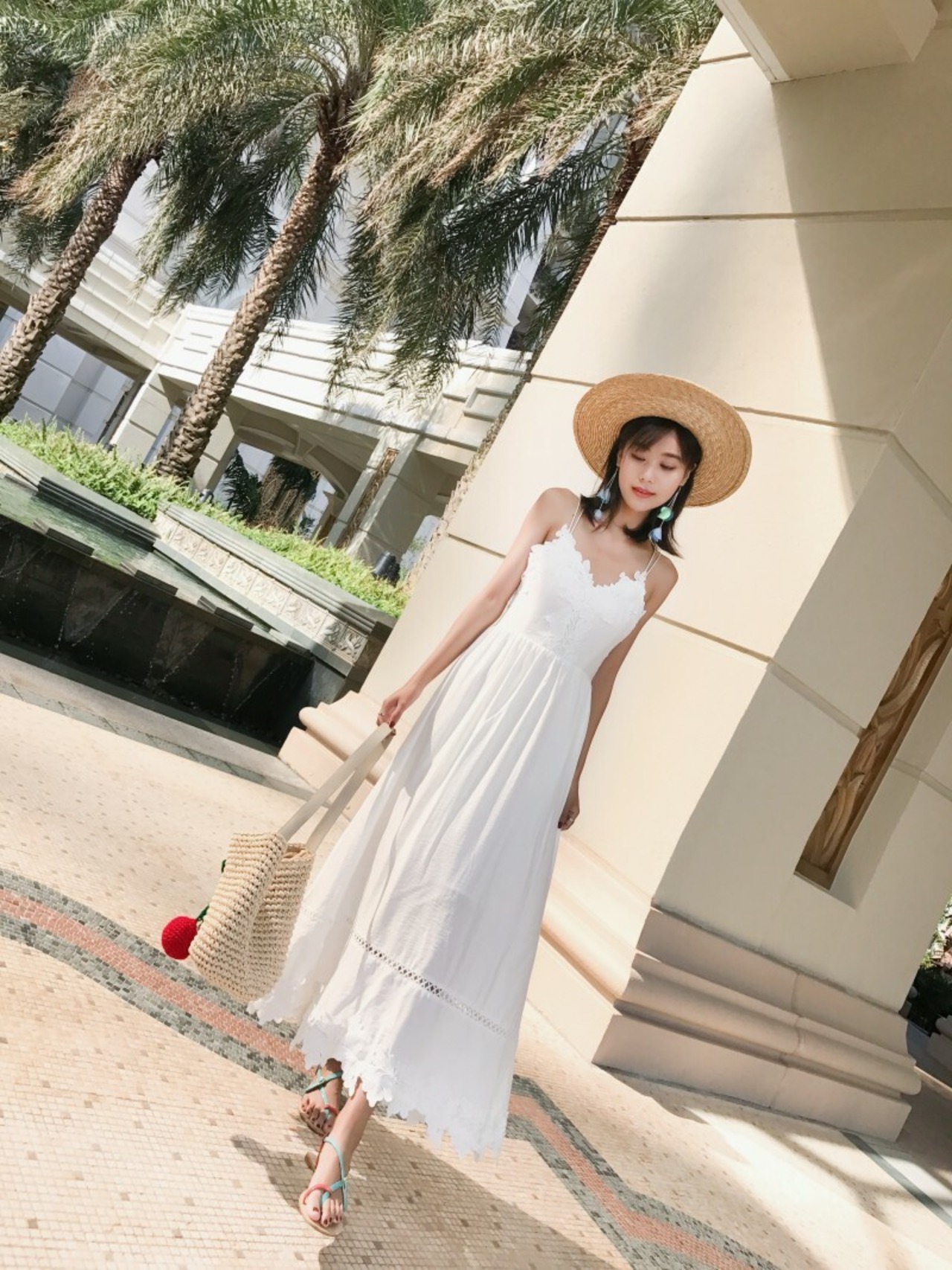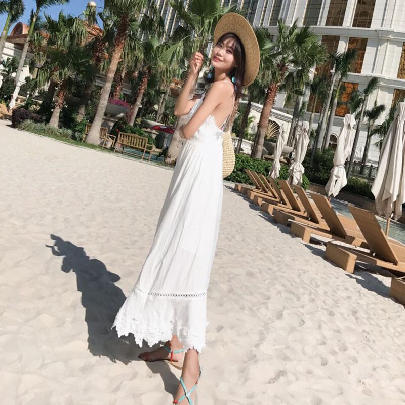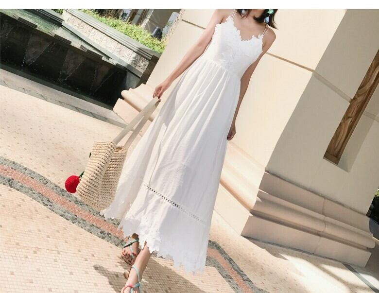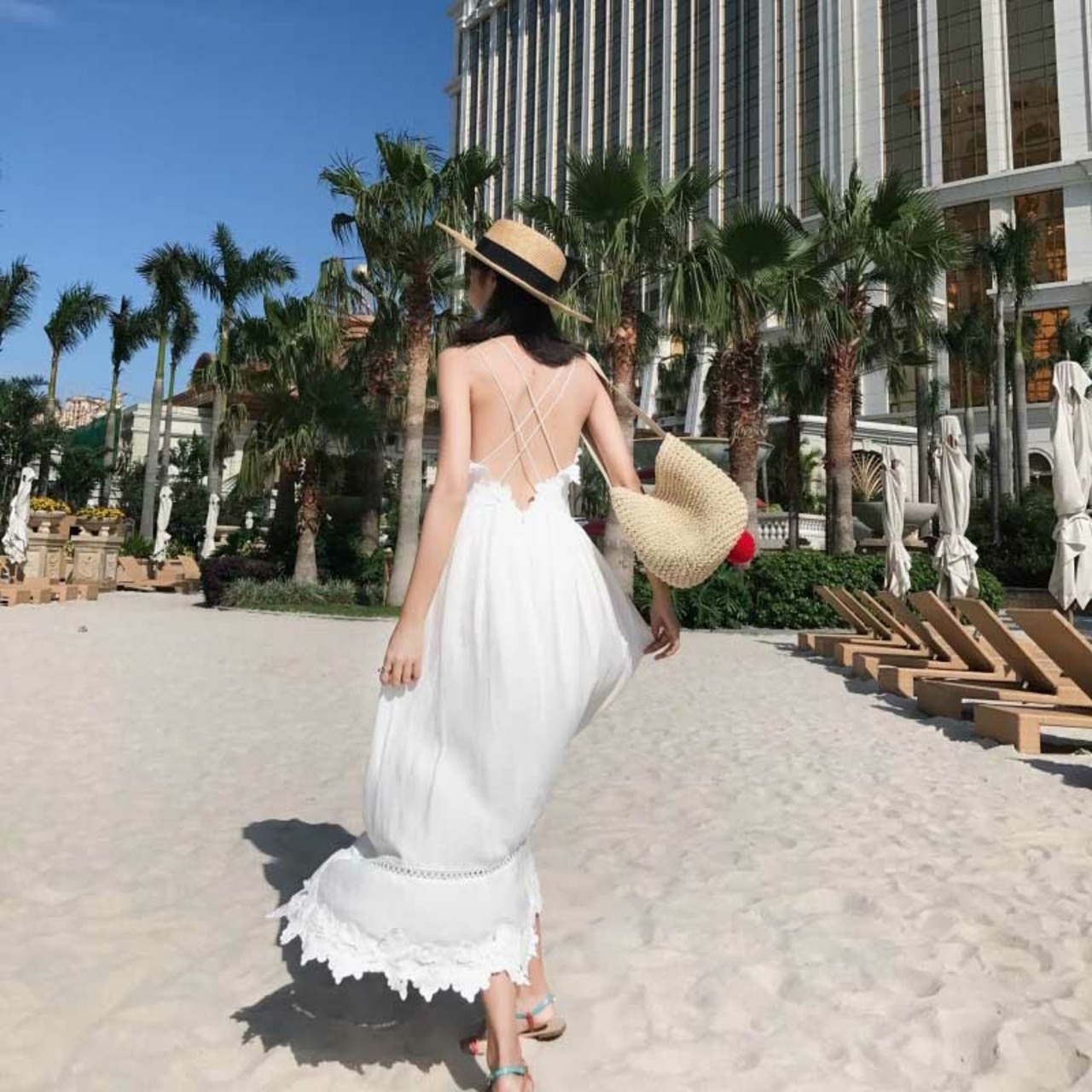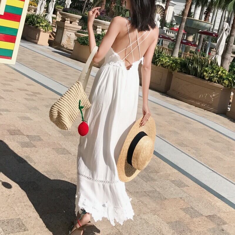コットンレースの夏定番のホワイトワンピース。バッククロスストラップがヘルシーなセクシー。リゾート、旅行にもってこいのサマードレス。丁度いいマキシ丈で歩きやすい。