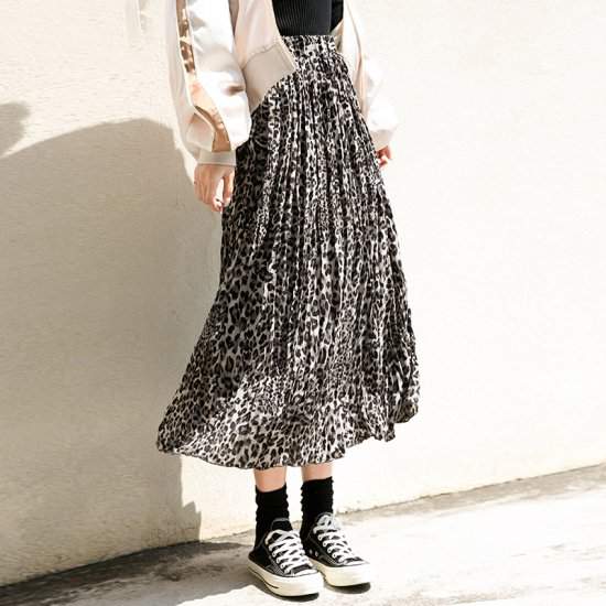旬柄レオパード ハイウエスト プリーツロング 着やせ イエロー 色