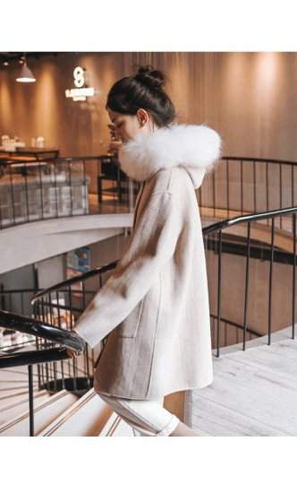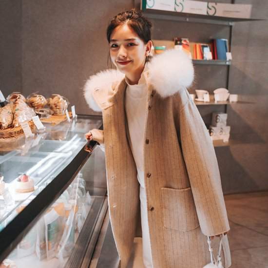 オススメ 新作 冬物ウール ロング丈 フード ファー エコファー ストライプ ピンストライプ ステンカラー