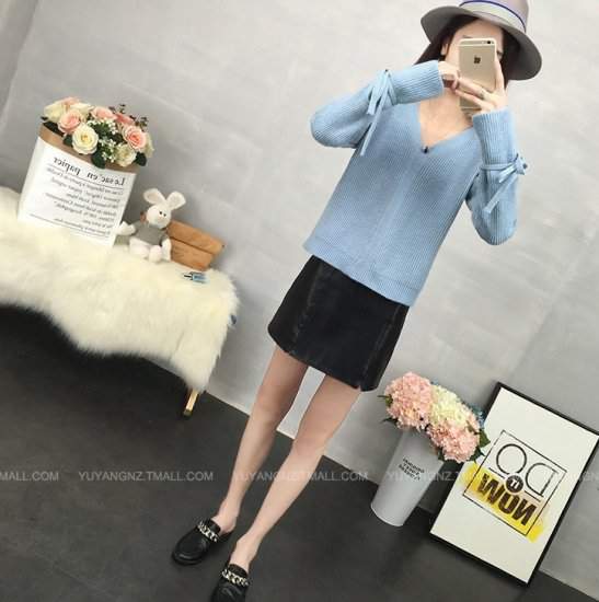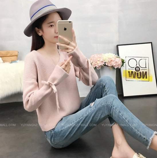 オルチャン韓国ニット 可愛い フェミニン リボン Vネック 袖コンシャスデート シンプル cd