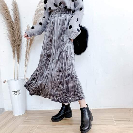 冬 新作 プリーツベルベット ロング丈 女子会 デイリー ハイウェスト ガーリー サテン