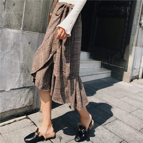 NWミモレ丈 チェック グレンチェック ラップ フリル トレンド 上品