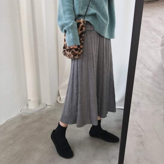 オルチャン韓国売れ筋 今季トレンドニット ワイドリブ ミモレ丈 フレア Aライン シンプル