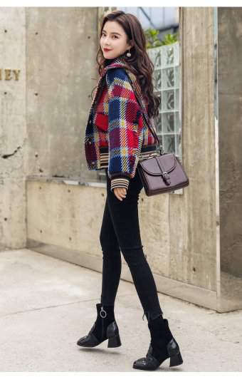 ウールチェック柄 ショート丈 ブルゾン フラップ付ポケット 襟付き 前ボタンドロップショルダーボリュームスリーブ