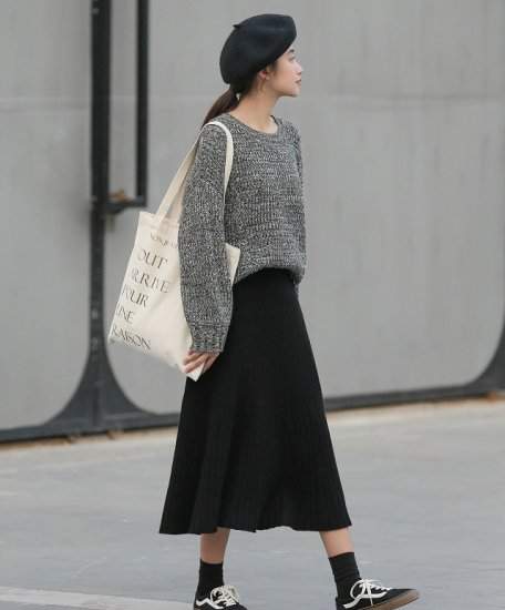 オルチャン韓国新作 売れ筋 冬 ニットフレア ミモレ丈 シンプルカジュアル