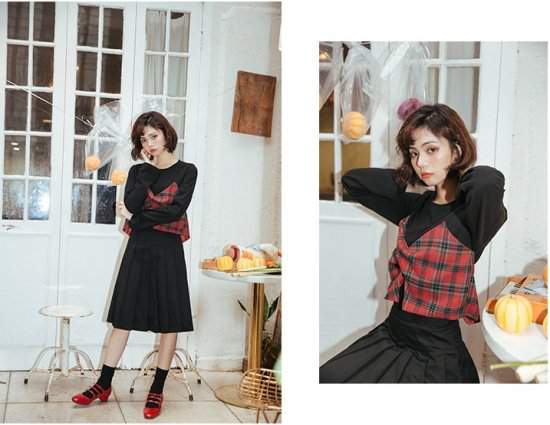 おすすめ ドッキング レイヤード風 チェック ラウンドネックカジュアル ガーリー 秋冬
