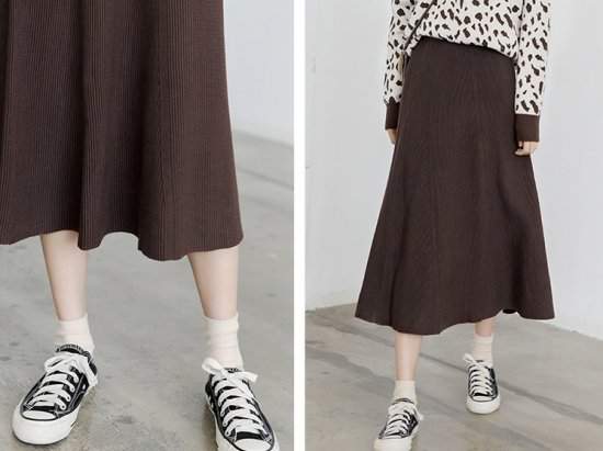 オルチャン韓国冬 オススメ フレア ミモレ丈 リブニットシンプル トレンド ガーリーフレア