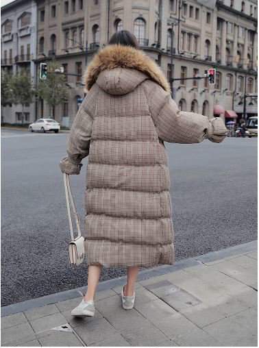 ロング丈 中綿 フードファー ボリュームファー チェック柄 厚手 暖か オーバーサイズ ゆったり ラグランスリーブ 膝下