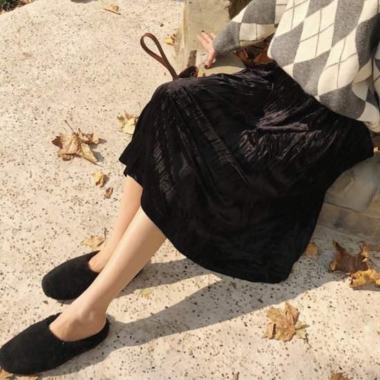 冬 トレンドロング丈 ベルベット生地 プリーツガーリー フェミニン ふんわり