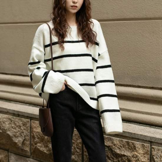 オルチャン韓国売れ筋 おすすめ ニットボーダーラウンドネック シンプル カジュアル ワンサイズ 秋冬
