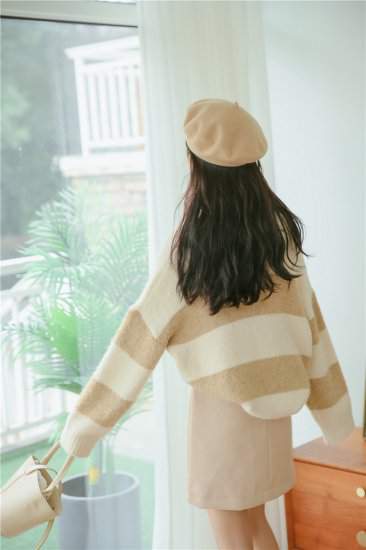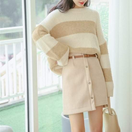 オルチャン韓国トレンド売れ筋 おすすめ ニットボーダー柄 クルーネック ゆったり ボリューム袖 ドロップショルダー カジュアル