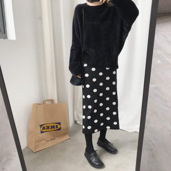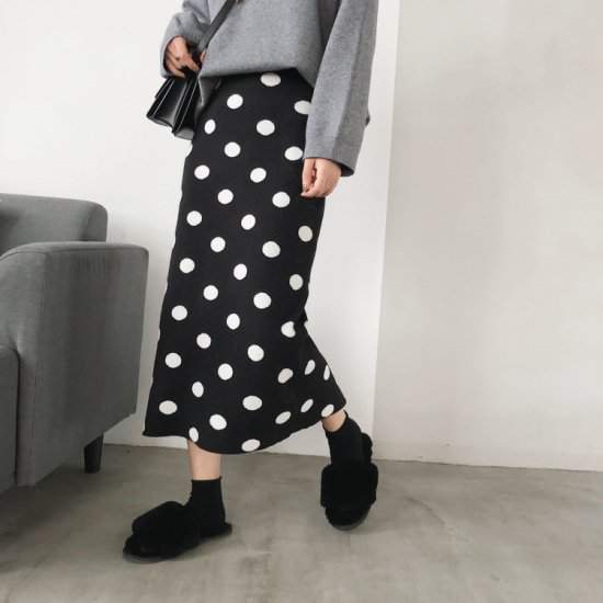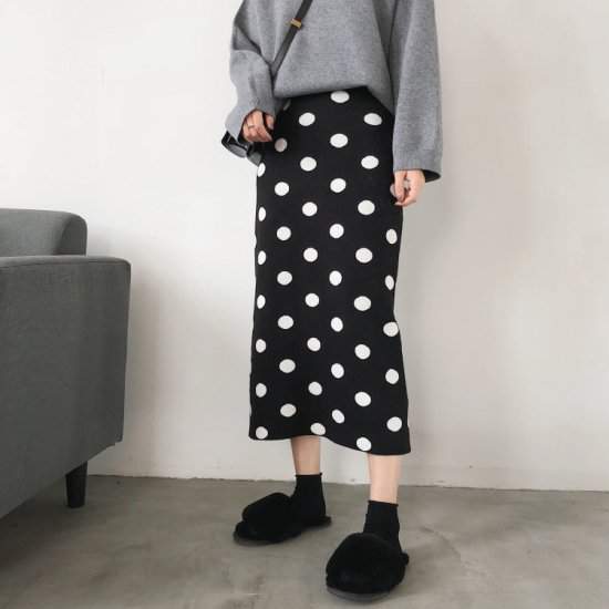 オルチャン韓国おすすめ ニットタイトロング ドット柄 ポルカドット カジュアル ストレート ストレッチ スリット