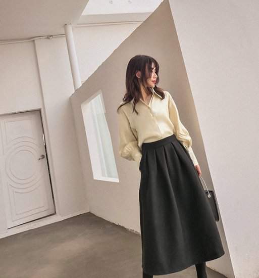 人気 春物 膝下丈 ハイウエストフレア タックモノトーン キレイめ