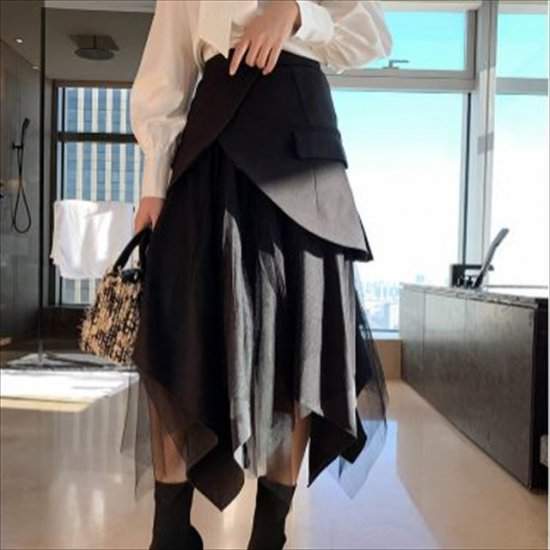 """春物 ロング 膝下丈 レイヤード風 フェミニンオーガンジー 透け感 シック ガーリー チュール不規則裾 プリーツ"""