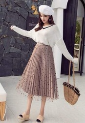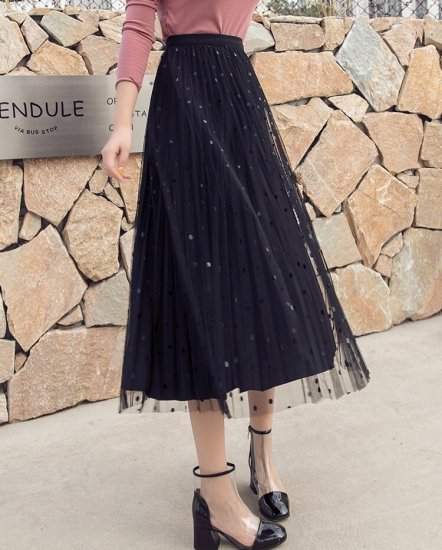 新作 人気 トレンド 春 膝下丈 プリーツチュール ドット柄 リバーシブル ハイウエスト キレイめ