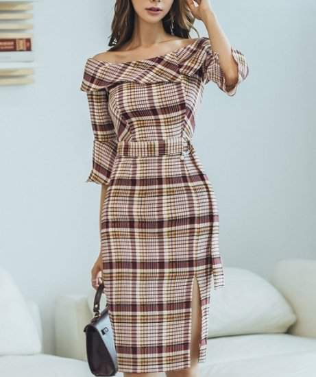 タイトチェックオフショルダー肌見せハイウエストオルチャン525