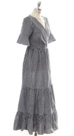 ティアードフリル ギンガムチェック エレガントマキシ丈ワンピース 春夏 ロング Vネック ハイウエスト mih0022377